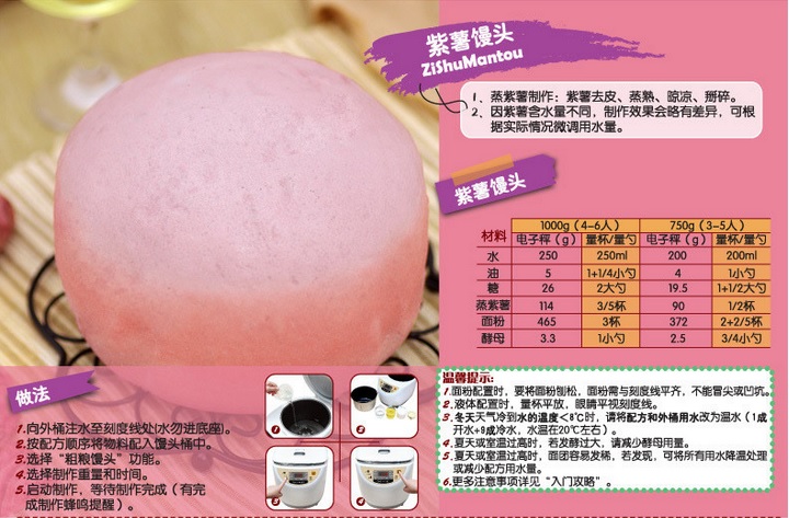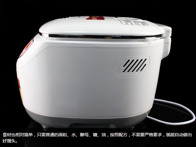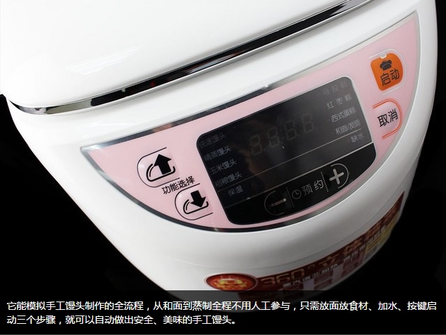 能模拟手工馒头制作的全流程,从和面到蒸制全程不用人工参与,只需放面放食材、加水、按键启动三个步骤